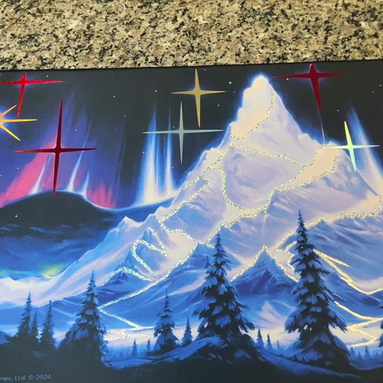 Celeste - Celestial Skies Fangamer/Extremely OK Games officially licensed desk mat/mousepad - Altered by me, premium foiling in multiple colors: Red, silver, and gold holographic foiling, with glittery mountains. Size: 35"x16" original cardboard tube included see last photo for reference.