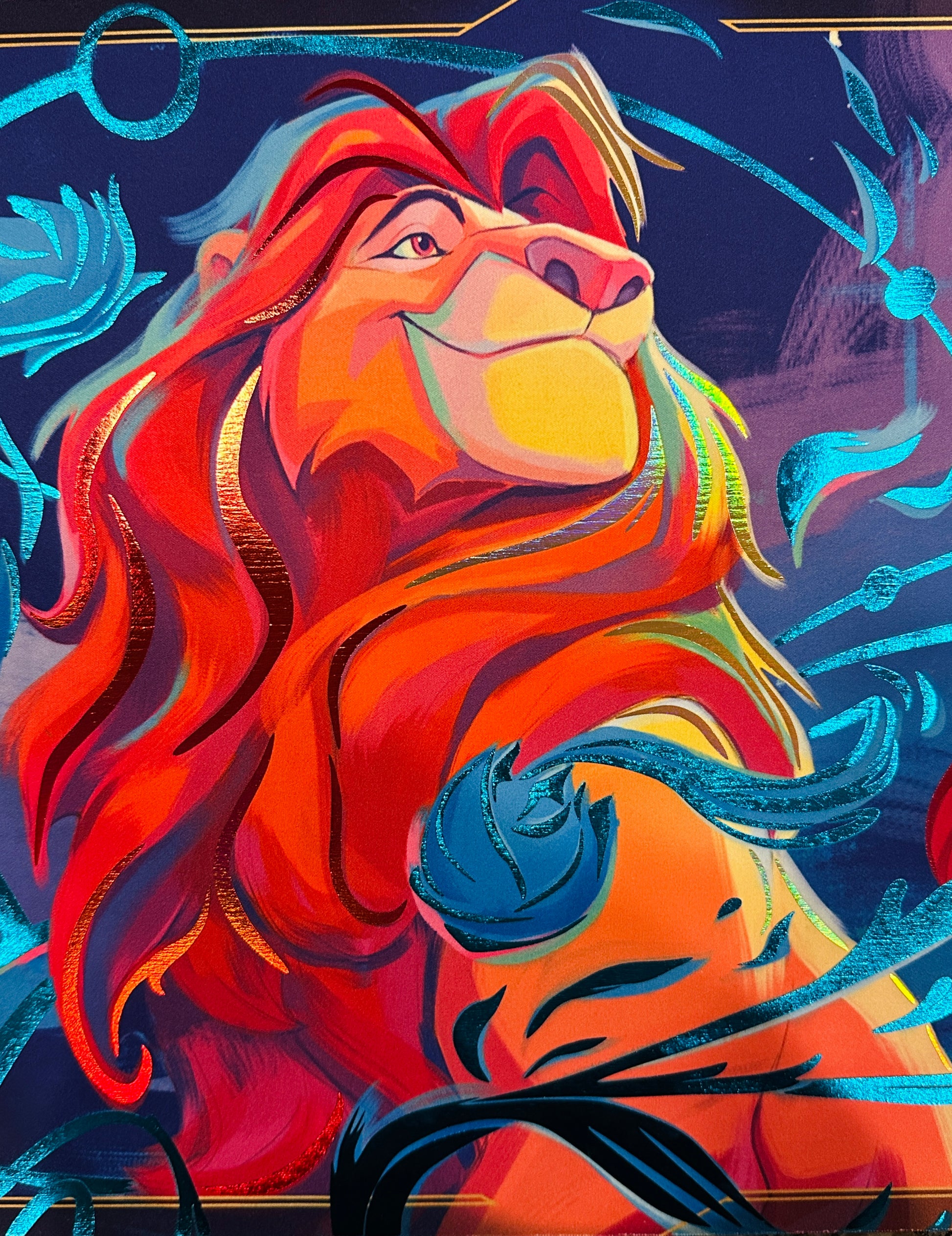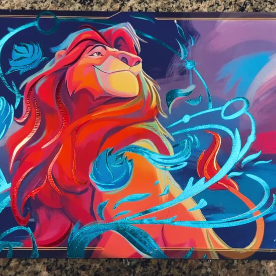 Officially Licensed Playmat Ravensburger/Disney Lorcana - Mufasa - Altered by me, premium foiling with metallic blue floral/swirl, red & gold holo in his mane, fur, and tail! I really love this one, all the tiny details and colors :)